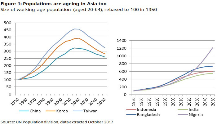Demographics are more favourable in other parts of Asia – for instance, in Bangladesh, Indonesia and India – and even more so in Africa, where the working age population of Nigeria alone is forecast to increase in size by around two thirds between 2015 and 2050 (Figure 1, right-hand chart).