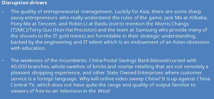 Inevitably the here and now is dominated by China. Once the political will was there, the rest followed given the advantages of scale, economic heft and homogeneity that China uniquely possesses. However, do not underestimate the speed of adoption in other Asian markets, where the basic conditions in terms of average wealth, youthful open-minded populations and weak incumbency co-exist.