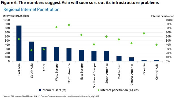 This is clear in Asia’s adoption of the internet. Despite the many infrastructure challenges faced by the web, they will be overcome. The situation where East Asia has almost 900 million internet users but only 55% penetration, or South Asia has almost 500 million with under 30% penetration is only going to resolve itself one way (Figure 6).