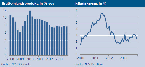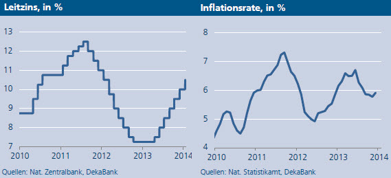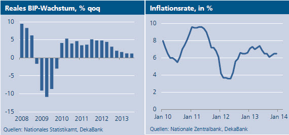 Das vergangene Jahr lief nicht gut für Russland. Die BIP-Prognosen wurden immer wieder nach unten revidiert. Eine signifikante Veränderung ist vorerst nicht in Sicht: „Russlands Wirtschaft leidet unter schwacher Exportnachfrage, gedämpfter Konsumtätigkeit und fehlender Investitionsbereitschaft“, stellt Yvonne McCarthy, Deka-Expertin für Mittel- und Osteuropa, fest. „Das Ende des Öl-Booms macht es dringend notwendig, strukturelle Reformen in die Wege zu leiten.“ Angesichts der angekündigten Änderung der Währungspolitik durch die Russische Zentralbank (CBR) schließt sie zudem steigende Inflationsraten nicht aus. Mit einem Zurückfahren der Devisenmarktinterventionen will die CBR die Märkte auf einen frei floatenden Rubel ab 2015 vorbereiten. „Wir rechnen im laufenden Jahr mit einem etwas stärkeren Wirtschaftswachstum von 2,1 Prozent“, so McCarthy. „Die Inflationsrate sollte im Jahresverlauf auf unter sechs Prozent sinken, aber nicht auf die von der Zentralbank als Zielwert angegebenen fünf Prozent.“