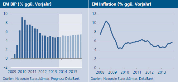 Die DekaBank gibt aktuell einen durchwachsenen Ausblick für die Schwellenländer: „Gemessen an den Einkaufsmanagerindizes hat sich in den Emerging Markets die Stimmung im Unternehmenssektor im Dezember etwas eingetrübt“, stellen die Volkswirte fest. „Die Niveaus deuten auf eine verhaltene Wachstumsdynamik hin, was angesichts der Belastungen, denen die Kapitalmärkte 2013 ausgesetzt waren, aber auch schon als ein Erfolg betrachtet werden kann.“ Für 2014 erwarten sie lediglich eine geringe Beschleunigung des Wirtschaftswachstums von 4,6 Prozent auf 4,8 Prozent. Das deutlich schnellere Wachstum der Schwellenstaaten im Vergleich zu den Industrieländern dürfte sich damit auch im laufenden Jahr fortsetzen. „Allerdings wird die Entwicklung durch ein verschlechtertes globales Finanzierungsumfeld belastet“, geben die Experten zu bedenken. „Die Wachstumsraten dürften in Zukunft geringer ausfallen als in den vergangenen Jahren.“ Als größte Schwachstelle machen sie die Leistungsbilanzdefizite vieler Staaten aus. Damit steige deren Abhängigkeit von internationalem Kapital. „Doch die Auslandsverschuldung ist in den meisten Ländern moderat, sodass auch deutliche Währungsverluste verkraftet werden können.“