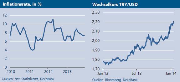 Die Türkei macht derzeit hauptsächlich wegen politischer Spannungen auf sich aufmerksam. Dadurch kam es zu Verwerfungen an den Märkten: „Die Türkische Lira hat deutlich abgewertet und nun die Marke von 2,20 TRY/USD geknackt“, sagt Mauro Toldo, Deka-Volkswirt für Lateinamerika, den Nahen Osten und Afrika. Er geht davon aus, dass die Schwäche der Währung in einem höheren Inflationsdruck münden wird. „Positiver ist der Effekt der Abwertung hinsichtlich des Abbaus der außenwirtschaftlichen Ungleichgewichte zu sehen, denn sie dürfte einen weiteren Rückgang des Leistungsbilanzdefizits in diesem Jahr ermöglichen.“