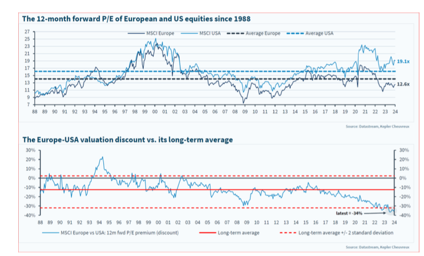 Noch viel besser kommen die Bewertungsunterschiede im unteren Diagramm zum Ausdruck. Bereits seit 2015 sind europäische Aktien gegenüber amerikanischen immer günstiger geworden und notieren inzwischen mit einem Discount von 34%; noch unter den Werten nach der Finanzkrise.