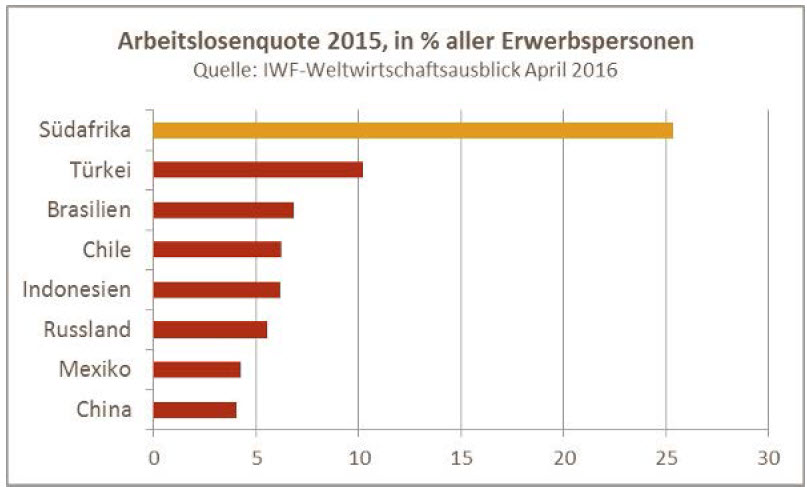 „Neben extremer Arbeitslosigkeit ist Ungleichheit ein schwerwiegendes Problem. Ca. 80 Prozent der Bevölkerung ist schwarz, wobei die verbleibenden 20 Prozent auch Minderheiten umfasst (z. B. gemischtrassig oder indischer Herkunft)“, so die Studie. „Doch nach wie vor werden Spitzenpositionen im Privatsektor überwiegend von weißen Männern und Frauen besetzt.“ Der Verfall der internationalen Rohstoffpreise, Dürren infolge von El Niño und die sinkende Nachfrage aus China hätten ihr übriges getan. Gefahr drohe aber auch von außerhalb: „Auch Kapitalzuflüsse sind vor dem Hintergrund des weltweit schwindenden Interesses an Investitionen in Schwellenländer volatiler geworden.“ Zur Finanzierung des strukturellen Leistungsbilanzdefizits seien Portfolioinvestitionen und andere Investitionszuflüsse jedoch unerlässlich.