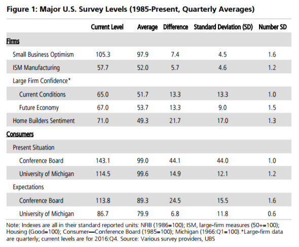 While the levels of surveys are not unprecedented, the movements we have seen overthe last several months have been particularly rapid. These rapid changes are one reason we believe the soft indicators have received so much attention. To further add to this view, these rapid moves are following long periods of relatively low sentiment. Six of the nine measures we analyze were well below their long-run averages prior to the election. Most of these survey measures are now at post-crisis peaks.Business confidence—buoyed by high policy hopes—is the most noteworthy.