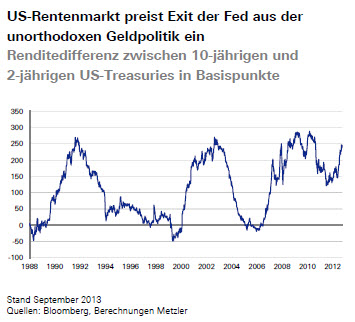 Aufgrund der extremen Steilheit der Renditestrukturkurve besteht kaum noch Potenzial für einen weiteren Renditeanstieg der 10-jährigen US-Treasuries, solange die Fed nicht mit dem Leitzinserhöhungszyklus beginnt und damit eine Verschiebung der gesamten Renditestrukturkurve einleitet. Frühestens ist dies jedoch erst ab dem zweiten Halbjahr 2014 wahrscheinlich. Darüber hinaus besteht das Risiko eines weiteren Renditeanstiegs bei steigenden Inflationserwartungen. Bisher waren diese zwar stabil und gut verankert, eine Rückkehr der Inflationsängste an die Finanzmärkte könnte aber für einen weiteren signifikanten Renditeanstieg sorgen. Derzeit gibt es jedoch wenige Anzeichen dafür, dass Inflationsrisiken bald ein Thema für die Finanzmärkte werden könnte.