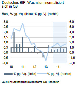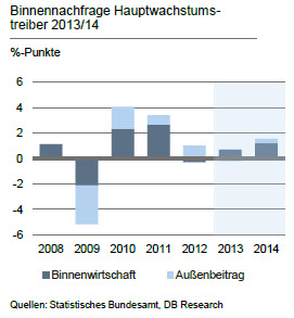 Das deutsche Bruttoinlandsprodukt (BIP) ist im dritten Quartal 2013 um 0,3 Prozent gegenüber dem Vorquartal gewachsen. Diese erste Schätzung des Statistischen Bundesamtes sei ausschließlich auf die Binnenkonjunktur zurückzuführen. „Während der private Verbrauch sowie die Bau- und Ausrüstungsinvestitionen zum Wachstum beitrugen, führte ein starker Anstieg der Importe bei annähernd stagnierenden Exporten zu einem negativen Außenbeitrag“, erläutert Stefan Schneider von DB Research. „Dies mag vor dem Hintergrund des kürzlich gemeldeten Rekordüberschusses der Handelsbilanz im September von 20,4 Milliarden Euro überraschen, allerdings wird in der volkswirtschaftlichen Gesamtrechnung die reale Entwicklung betrachtet, während in der Handelsbilanz nominale Größen dargestellt werden.“ Frühindikatoren deuteten auf eine ähnliche Entwicklung für das Schlussquartal hin, was für das Gesamtjahr aufgrund des schwachen Jahresstarts ein Plus von 0,5 Prozent ergebe. „Der Außenbeitrag dürfte mit rund 0,25 Prozentpunkten negativ ausfallen, nachdem er in 2012 noch ein Prozentpunkt zum Wachstum beigesteuert hatte“, sagt Schneider.