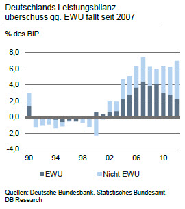 „Der ebenso absurde Vorwurf, dass die unverändert hohen deutschen Überschüsse die Anpassung in den europäischen Problemländern verhindern, zeugt zudem von einer verengten, bilateralen Sichtweise der Saldenmechanik und von Unkenntnis der relevanten Statistiken, die zeigen, dass sich die deutschen Überschüsse gegenüber der EWU seit Ausbruch der Krise auf 2,2 Prozent des BIP halbiert haben.“ Ohne die Finanzierung über das Target-2-System der EZB, wären sie Schneiders Meinung nach wohl komplett verschwunden. Durch einen Rückgang der deutschen Exporte um drei Prozent und einen deutlichen Anstieg der Importe der anderen EWU-Staaten um elf Prozent, hätten die Überschüsse erst abgebaut werden können.