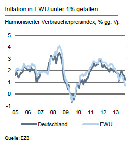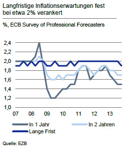 Kritik gibt es auch an den deutschen Vertretern im EZB-Rat. Durch ihren – letztlich erfolglosen – Widerstand gegen Zinssenkungen zum jetzigen Zeitpunkt und gegen eine noch aggressivere Geldpolitik der EZB, wollten sie eine Schwächung des Euro und eine bessere Kreditversorgung der Peripheriestaaten verhindern. Das Ergebnis wäre ein Anstieg des deutschen Leistungsbilanzüberschusses. Die Ratio der letzten Zinssenkung kann Schneider nicht restlos überzeugen. Deren Begründung mit sinkender Inflationsrate und steigender Gefahr einer Deflation laufe angesichts nahezu unveränderter mittel- und langfristiger Inflationsprognosen im aktuellen von der EZB durchgeführten „Survey of Professional Forecasters“ fehl. Hinzu komme, dass die niedrigen Inflationsraten in den Peripheriestaaten das beabsichtigte Resultat der von der EU-Troika (zu der die EZB gehört) verordneten Reformen seien. „Der Versuch, die durchschnittliche Inflationsrate in der Eurozone trotz der deflationären Wirkung der verordneten Angebotsschocks bei knapp unter zwei Prozent zu halten, würde nur gelingen, falls die nationalen Inflationsraten in Deutschland und anderen Kernländern Richtung fünf Prozent steigen würden“, sagt Schneider. „Dies entspräche wohl der von den Kritikern sehnlichst gewünschten Korrektur.“ Die deutschen Konsumenten und Sparer hätten dann – so der Experte – allerdings einen großen Teil der Anpassungslasten innerhalb der Eurozone zu tragen. „Ein wohl nicht ganz unbeabsichtigter ‚Nebeneffekt‘ in derartigen Überlegungen.“