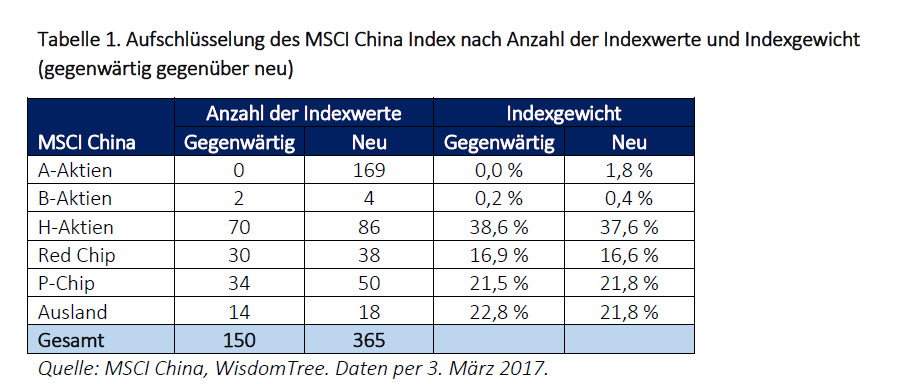 Im Gegensatz zu früheren Vorschlägen von MSCI, die eine Erweiterung des Index um 448 A-Aktien vorsahen und die zu substanzielleren Änderungen geführt hätten, hat der gegenwärtige Vorschlag nur zusätzliche 169 A-Aktien mit einem Aufnahmefaktor von 5 % zur Folge. Die wesentliche Änderung besteht darin, dass ausschließlich große Unternehmen, die über die Stock Connect-Programme von Shanghai und Shenzhen zugänglich sind, die Voraussetzungen erfüllen würden. Von entscheidender Bedeutung ist, dass A-Aktien der Unternehmen, die bereits H-Aktien im MSCI China Index besitzen, nicht aufgenommen würden. Auch wenn es sich um einen interessanten Kompromiss handelt, bietet der resultierende Index – fast konzeptionsbedingt – weniger Inklusion als der Ansatz, den S&P bei der Entwicklung des S&P China 500 übernommen hat, und führt lediglich zu einer minimalen Änderung. Das Gewicht der in den Index aufzunehmenden neuen A-Aktien beträgt nur 1,8 %.