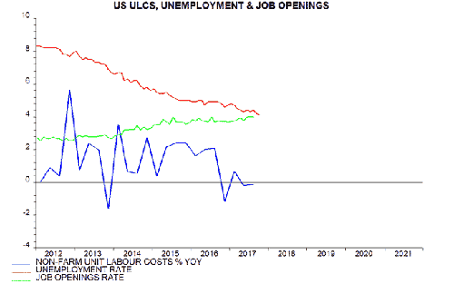 Developments since 2012 echo the first half of the 1960s, with annual unit labour cost growth remaining weak despite a steady narrowing of the unemployment rate-job openings rate gap – second chart. The gap fell below 0.5 pp in April 2017, suggesting – based on the historical experience – a rise in unit labour cost growth by mid-2018.