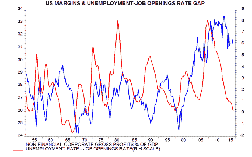 Faster unit labour cost growth would put upward pressure on (core) inflation and downward pressure on profit margins. Either would be negative for markets but the balance would affect the relative attraction of equities and Treasuries. A scenario in which margins took more of the strain, for example, would imply deteriorating economic prospects and rising recession risk, suggesting support for Treasuries despite a near-term inflation increase. Margins have fallen back since 2014 but remain elevated by historical standards – third chart.