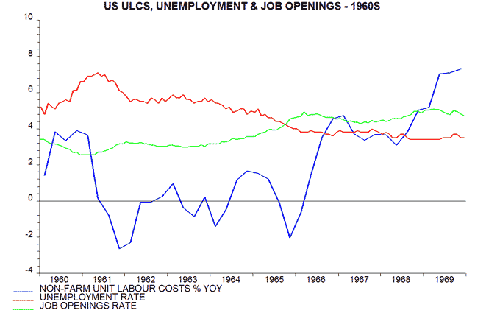 In 1965, by contrast, the unemployment rate fell well beneath the job openings rate and a negative gap was sustained through 1970. Annual unit labour cost growth moved up from around zero in 1964-65 to 4% over 1966-68, with a further ratchet higher to 7% in 1969 – see first chart.