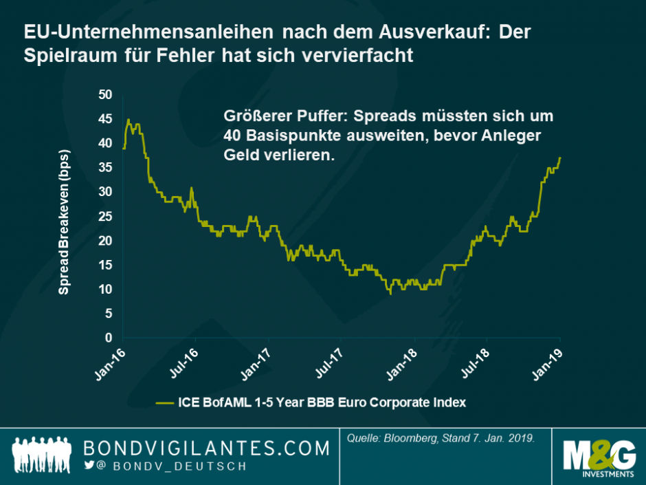 Puffer – Kreditausverkauf erhöht den Spielraum für Fehler: Auch wenn er weh tat, sorgte der jüngste Ausverkauf am Kreditmarkt zumindest dafür, dass Anleger ein größeres Schutzpolster vor Verlusten haben: Laut M&G-Fondsmanager Wolfgang Bauer müssten sich die Spreads von kurzlaufenden europäischen Unternehmensanleihen mit Investment Grade in diesem Jahr um 40 Basispunkte (bps) weiten, bevor sie die Anleger in den Bereich negativer Renditen bringen. Dieser Puffer, berechnet als OAS/Libor-Spread dividiert durch die Spread-Duration des Index, lag vor knapp einem Jahr noch unter 10 Basispunkten, ein Niveau, das praktisch eine Perfektion einpreiste. Wie in der Grafik zu sehen ist, nimmt der Puffer im Zuge fallender Märkte zu, insbesondere nach den italienischen Wahlen im Mai, die Befürchtungen über die Zukunft der EU aufkommen ließen. Diese Marge hat inzwischen den höchsten Stand seit etwa zwei Jahren erreicht und ist etwa viermal so hoch wie vor einem Jahr. Laut Wolfgang Bauer sind europäische Unternehmensanleihen jedoch nach wie vor anfällig für eine politische Volatilität und ein hohes Angebot (meist ein negativer Faktor für die Anleihenkurse). Auch die Daten aus Europa sind enttäuschend, obwohl das Wirtschaftswachstum in diesem Jahr voraussichtlich immer noch um 1,6% und im Jahr 2020 um 1,5% steigen wird (gegenüber 1,9% im Jahr 2018). Verpassen Sie nicht den Kredit Rückblick von Wolfgang Bauer: Self-check, how did we do in our 2018 predictions?