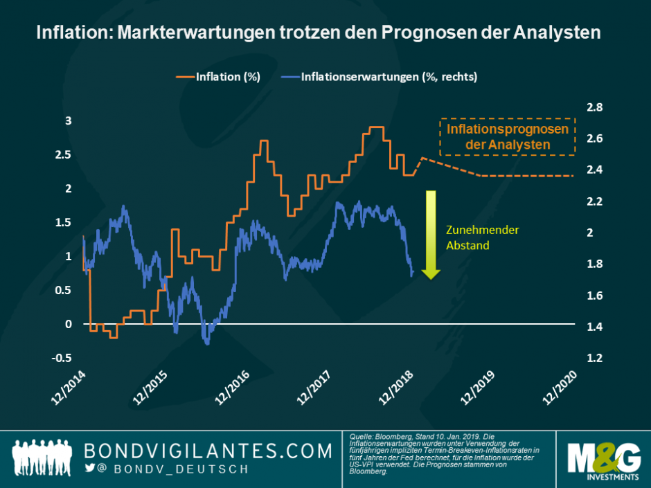 US-Inflationserwartungen – Powelled: Die jüngste Zusicherung des Fed-Vorsitzenden Powells, dass die Zentralbank weiterhin in Abhängigkeit von Daten agiert, die Marktreaktionen beobachtet und dass das Ausbleiben eines deutlichen Inflationsanstiegs nicht unbemerkt an ihr vorbeigeht, erwischte die Inflationserwartungen der USA eiskalt. Der bevorzugte Indikator der Fed für die Inflationserwartung – die fünfjährige Forward Breakeven-Rate (blaue Linie) – fiel auf 1,75%, den niedrigsten Stand seit Juni 2017, auch aufgrund des jüngsten Rückgangs der Ölpreise. Dieser Wert liegt deutlich unter den Prognosen für die Verbraucherinflation des Landes (gestrichelte orangefarbene Linie), einem Mittelwert aus mehreren Analystenschätzungen, die derzeit von einer Inflationsrate von 2,4% für das Jahr 2018 ausgehen, die sich sowohl 2019 als auch 2020 auf 2,2% abschwächt. Wie in der Grafik zu sehen ist, unterbricht der zunehmende Abstand zwischen den beiden Größen eine enge Korrelation der letzten Jahre: Einige Marktbeobachter sagen, dies sei auf unrealistische Inflationsprognosen der Analysten zurückzuführen, während andere meinen, dass die Breakeven-Raten oder Markterwartungen zu pessimistisch sind, da die US-Wirtschaft weiterhin ein Wirtschaftswachstum von 2,6% in diesem Jahr und 1,9% im nächsten Jahr erwarten lässt. Wie immer gilt, dass aktive Investoren nach genau nach solchen Fehlbewertungen suchen – solange sie richtig liegen.