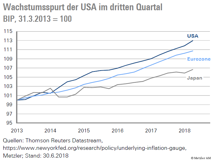 Die US-Wirtschaft strotzt derzeit vor Stärke. Schon im zweiten Quartal verzeichnete sie ein Wachstum von 4,2 % und koppelte sich damit von dem schwächeren Wachstum in der Eurozone und Japan ab. Auch im dritten Quartal stehen die Vorzeichen für ein dynamisches Wachstum (Freitag) gut. Das Modell der New York Fed prognostiziert ein Wirtschaftswachstum von 2,25 %, während das Modell der Atlanta Fed sogar ein Wachstum von 3,9 % antizipiert. Die Auftragseingänge (Donnerstag) im September dürften dabei mit einem kräftigen Plus die robuste Verfassung der US-Wirtschaft bestätigen – ebenso wie die Einkaufsmanagerindizes. Der Grund dafür ist ganz einfach der Fiskalstimulus.