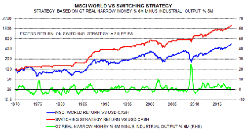 Such an approach would have been helpful for assessing global equity market prospects historically. We examined the relationship between the monthly excess return on the MSCI World index in US dollars relative to US dollar cash and the sign of the gap between the six-month rates of change of G7 real narrow money (using consumer prices as the deflator) and industrial output. The mean excess return on equities over cash between December 1969 and December 2017 (48 years) was 3.6% per annum (pa). The mean excess return in months following a positive signal from the real money / output growth gap was 10.2% pa*. By contrast, equities suffered a mean net loss of 4.8% pa in months following a negative signal.