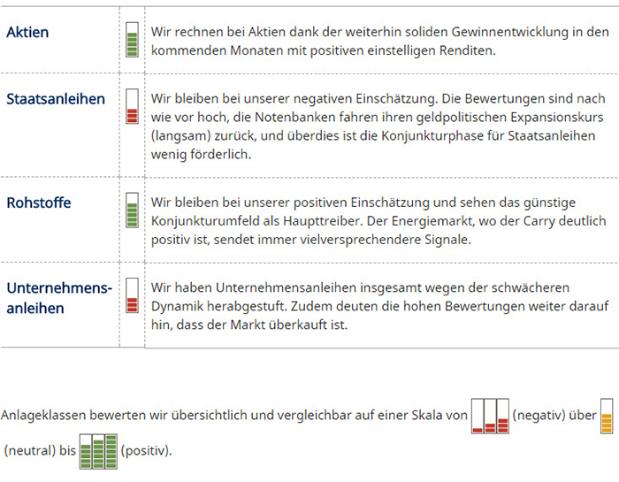 Hohe Bewertungen deuten bei Unternehmensanleihen darauf hin, dass der Markt überkauft ist, bei Rohstoffen dagegen wirkt das günstige Konjunkturumfeld als positiver Haupttreiber.