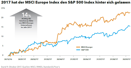 Europa könnte 2017 einen Wendepunkt erreicht haben, wirtschaftlich wie politisch. Der Wahlsieg Emmanuel Macrons scheint zu belegen, dass Politiker der Mitte Populisten in ihre Schranken verweisen können. Der MSCI Europe Index hat den S&P 500 Index 2017 hinter sich gelassen. Doch obwohl sich Europa nach einem schwierigen Jahrzehnt zu erholen scheint, gibt es noch immer Risiken. Dazu zählen die hohe Arbeitslosigkeit in manchen Ländern und die anhaltende Unsicherheit aufgrund der britischen Entscheidung gegen die EU. Diese Themen haben den Aktienkursen einiger Unternehmen geschadet, sodass manche europäische Unternehmen jetzt recht attraktiv bewertet scheinen. Auch wenn der große Bewertungsabstand zwischen amerikanischen und europäischen Unternehmen in den letzten Wochen geschrumpft ist, gibt es noch immer Anlagechancen.