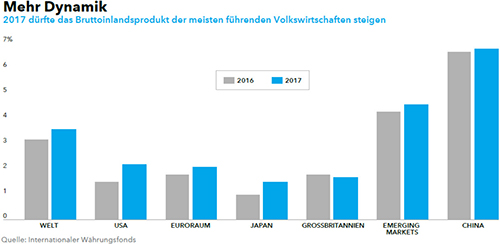 Insgesamt haben sich die Weltwirtschaft und die Finanzmärkte dynamisch entwickelt. Das belegt auch der World Economic Outlook des Internationalen Währungsfonds (IWF). Darin heißt es, dass sich fast alle wichtigen Volkswirtschaften im Aufschwung befinden. Der IWF hob auch seine Wachstumsprognosen an – auf 3,6 Prozent im laufenden Jahr und sogar 3,7 Prozent im kommenden Jahr. Zum Vergleich: Im Jahr 2016 war die Weltwirtschaft um lediglich 3,2 Prozent gewachsen. Der Trend ist hier also eindeutig positiv.