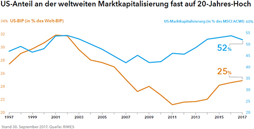 Ein wahres Rekordjahr gab es insbesondere bei US-amerikanischen Aktien. Der Dow Jones Industrial Average stieg bis Mitte Oktober des zu Ende gehenden Jahres 47-mal auf neue Rekordhöchststände, der S&P 500 Composite verzeichnete im neunten Jahr der Hausse 43 neue Rekordhochs. Auf Gesamtertragsbasis ist er von Januar bis September jeden Monat gestiegen. Das gab es bislang nur einmal, nämlich 1995. Und auch der Nasdaq Composite stieg 2017 mehrmals auf neue Rekorde. US-Aktien sind deshalb heute recht teuer. Natürlich lassen sich die hohen Bewertungen mit einer Reihe von Faktoren begründen, auch mit der guten Konjunktur. Das Wachstum ist zwar nicht extrem, aber die US-Wirtschaft macht Fortschritte. Die Arbeitsmarkt- und Industriedaten waren in diesem Jahr recht gut, und auch das Geschäftsklima und das Verbrauchervertrauen waren hoch. Die Marktkapitalisierung bestätigt ebenfalls, dass US-Aktien nicht weit von ihrem Allzeithoch entfernt sind.
