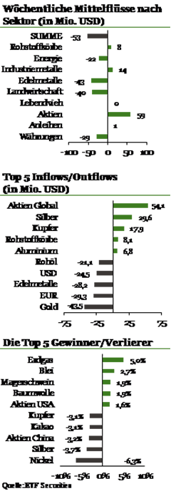 Aufgrund der für Dezember drohenden Zinsanhebung der Fed kam es in der vergangenen Woche bei Gold-ETPs (A0N62G) zu Abflüssen in Höhe von 43 Mio. USD. In den letzten zwei Monaten waren kontinuierlich insgesamt 450 Mio. USD zugeflossen. „Trotz der Abflüsse sind wir überzeugt, dass Gold aufgrund der nach wie vor mangelnden Nachfrage nach dem US-Dollar, der zunehmenden geopolitischen Ängste hauptsächlich in Zusammenhang mit Nordkorea und der befürchteten Auswirkungen der geldpolitischen Anpassungen nichts von seiner Beliebtheit einbüßen wird“, so Hein.