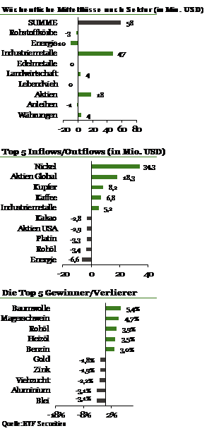 Industriemetalle wurden bei Preisrückschlägen gekauft. Breit aufgestellte Industriemetall-ETPs (A0SVX7) verzeichneten in der zweiten Woche in Folge Zuflüsse (5,0 Mio. USD), da die Anleger bei Preisrückgängen die Gelegenheit zum Kauf nutzten. Bei Long-Kupfer-ETPs (A0KRJU) erreichten die Zuflüsse mit 8,7 Mio. USD ein Vierwochenhoch. Nach den Angaben der Internationalen Studiengruppe Kupfer in der letzten Woche ging die weltweite Bergbauproduktion in den ersten elf Monaten 2017 um 2,4 Prozent zurück, während die Erzeugung von raffiniertem Kupfer Schätzungen zufolge weltweit im selben Zeitraum um 0,5 Prozent zunahm. Für 2018 rechnet die Studiengruppe wieder mit einem Versorgungsdefizit, da das Angebot knapp bleibt, die Nachfrage aber steigt. Starke strukturelle Unterstützung erfährt Kupfer durch die Fahrzeugelektrifizierung, da die Stromnetze modernisiert werden müssen und die Autos größere Kabelmengen benötigen. Nickel-ETPs (A0KRJ4) verzeichneten erneut Zuflüsse, diesmal in Höhe von 34,3 Mio. USD. Nickel profitiert ebenfalls von der Elektrifizierung der Fahrzeuge (siehe Rohstoffresearch: Nickel: Elektrifizierung könnte Nachfrage anregen)