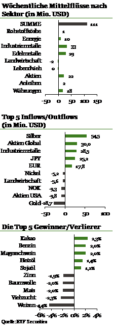 Long-Yen-ETPs zogen mit 25,2 Mio. USD die höchsten bisher verzeichneten Zuflüsse an, da die Anleger aufgrund der globalen politischen Verwerfungen offenbar Zuflucht in den historisch sicheren Währungen suchten. Die von Norwegens Notenbank signalisierte Straffung der Geldpolitik führte bei NOK-ETPs zu Abflüssen in Höhe von 9,3 Mio. USD. In der letzten Woche signalisierte Norwegens Notenbank, dass sie die Zinsen schneller als erwartet anheben werde. Grund seien das stärkere Wachstum und eine Änderung des Inflationsziels. Die norwegische Krone stieg in der Folge um 0,9 Prozent auf ihren höchsten Stand seit November 2017.