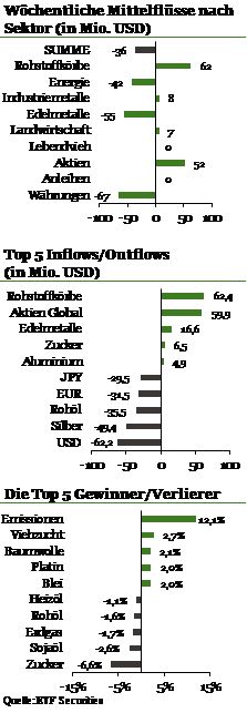 Bei Edelmetallen (A0N62H) kam es zu Abflüssen in Höhe von 55 Mio. USD, von denen in der letzten Woche 49 Mio. USD auf Silber-ETPs (A0N62F) entfielen. Seit Jahresanfang belaufen sich die Abflüsse auf 77 Mio. USD. „Die Gold-Silber-Ratio liegt derzeit mit 78 eine Standardabweichung über ihrem Durchschnitt. Aus historischer Sicht ist Silber also nach der jüngsten Goldpreisrally günstig bewertet“, so Hein.