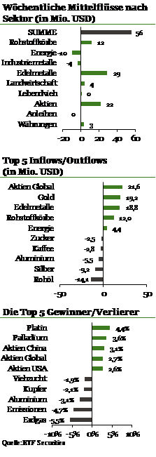 Bei Edelmetall-ETPs (A0N62H) kam es zu hohen Zuflüssen im Wert von 18,8 Mio. USD. Palladium setzte seinen letztjährigen Trends fort und erreichte zum ersten Mal seit 17 Jahren wieder die Marke von 1100 USD. Dabei profitiert der Palladiumpreis insbesondere von der Furcht vor einer Angebotsknappheit. „Unseren Erwartungen zufolge wird aber Platin, das ähnlich gehandelte Pendant von Palladium, dank seines Preisrückstands und der Stärkung des europäischen Automobilmarkts besser abschneiden“, sagt Hein.