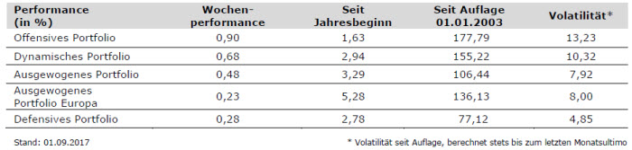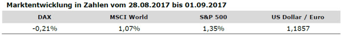 Diese stieg im August laut der ersten Schätzung auf 1,5 Prozent an. Damit wurde der Konsensus zum dritten Mal in Folge übertroffen. Im Hinblick auf die Hauptkomponenten der Inflation im Euroraum wird erwartet, dass Energie im August die höchste jährliche Rate aufweist (4,0 Prozent gegenüber 2,2 Prozent im Juli), gefolgt von Dienstleistungen (1,6 Prozent, unverändert gegenüber Juli), Lebensmitteln, Alkohol und Tabak (1,4 Prozent, unverändert gegenüber Juli) und Industriegütern ohne Energie (0,5 Prozent, unverändert gegenüber Juli). In den USA zeigte sich der Arbeitsmarkt insgesamt solide, obwohl mit 165.000 neu geschaffenen Stellen und einem Anstieg der Arbeitslosenquote auf 4,4 Prozent die Erwartungen jeweils nicht erfüllt wurden. Das Ergebnis des ISM-Index im verarbeitenden Gewerbe zeigte indes einen deutlichen Anstieg auf 58,8 Punkte.