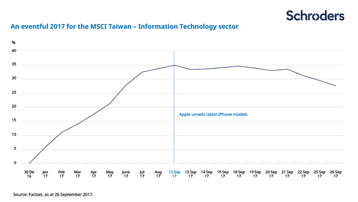 From the start of this year to 12 September (when the newest iPhones were unveiled), the MSCI Taiwan – Information Technology sector had returned nearly +34%. Since then a gradual selloff in the sector has ensued and it is now down by over 7% from its peak, with news that iPhone 8 pre-orders have been weaker-than-expected not helping sentiment. For now, investors in these companies can at least take solace in the fact that there is always another iPhone launch to look forward to in a year’s time.