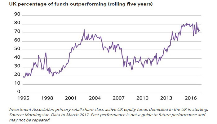 Bearing this in mind, Ralston looked at the UK market and only included funds benchmarked to a broad index. He only included funds that had a full five years of performance history at a given date.