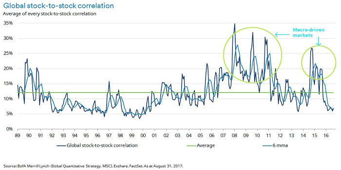 This is particularly important for stockpickers, who aim to use in-depth analysis to find companies best-placed to outperform the market. For these “bottom-up” active managers, there could be some good news in this chart, which shows correlation has fallen below its long-term average.