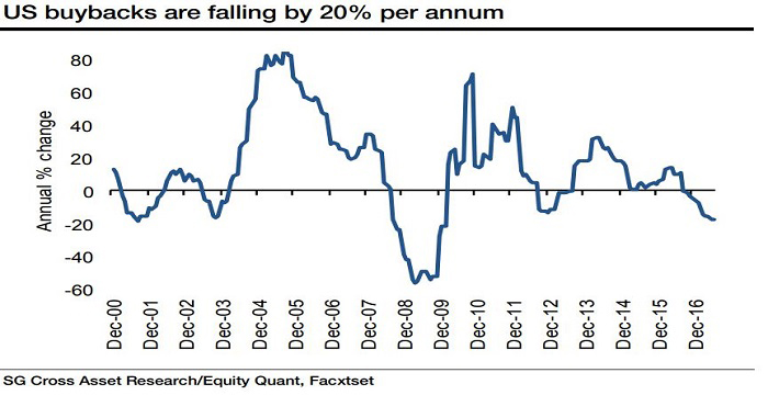 Stock repurchases have been a large component of net inflows into US equities during the bull market. Equity analysts had expected the high level of buyback activity to return in 2017 on expectations of President Trump’s corporate tax cuts particularly in relation to encouraging repatriation of cash held overseas.