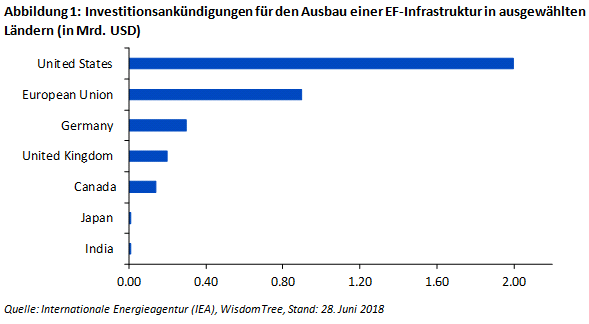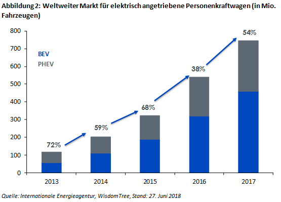 2017 wurden weltweit erstmals über eine Million Elektrofahrzeuge verkauft, eine Steigerung von 54 Prozent gegenüber dem Vorjahr1 und höher als die jährliche Wachstumsrate von 38 Prozent in 2016. Auf China entfielen rund 50 Prozent der globalen EF-Verkäufe, was einen Marktanteil von 2,2 Prozent in Jahr 2017 darstellt. Die International Energieagentur (IEA) hat ihre zentrale Prognose für EF verdoppelt und ihre Schätzung der vorhandenen EF in 2030 von 23 Mio. auf 58 Mio. angehoben. Eng angelehnt an das Wachstum der Ladeinfrastruktur lag der Absatz von reinen Elektrofahrzeugen (BEV) mit einer Steigerung von 63 Prozent vor dem von Plug-in-Hybriden (PHEV) mit einer Steigerung von 40 Prozent in 2017. BEV werden ausschließlich von einem Elektromotor betrieben; der Strom wird dabei in einer Batterie gespeichert, die regelmäßig aufgeladen werden muss. PHEV dagegen werden aus einer Kombination von Elektro- und Verbrennungsmotor angetrieben, die gemeinsam oder einzeln arbeiten können. Die Batterie des Fahrzeugs kann über das Stromnetz geladen werden; der Verbrennungsmotor unterstützt den Elektromotor, wenn eine höhere Betriebsleistung erforderlich oder die Batterie erschöpft ist. BEV sind am effizientesten und besonders umweltfreundlich, wenn sie durch erneuerbare Energien betrieben werden.