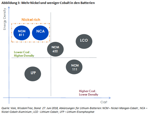 Die zunehmende Akzeptanz von EF führt zu einer steigenden Nachfrage nach neuen Metallen wie Nickel, Lithium, Kobalt, Kupfer und Aluminium. Die Familie der Lithium-Ionen-Batterien umfasst diverse chemische Zusammensetzungen, die verschiedene Kombinationen von Anoden- und Kathodenmaterialien verwenden. Man kann die Lithium-Ionen-Technologien anhand von sechs Kategorien miteinander vergleichen: Kosten, Sicherheit, Leistungsdichte, Energiedichte, Performance und Lebensdauer. In der Automobilbranche kommen hauptsächlich die Lithium-Akkus auf Basis von Nickel-Mangan-Cobalt (NMC) zum Einsatz. Schnelle technologische Fortschritte in der chemischen Zusammensetzung des Batterien weisen jedoch auf einen künftig höheren Anteil an Nickel hin. Während die NMC-Batterie üblicherweise Nickel, Mangan und Cobalt im gleichen Verhältnis enthält (1-1-1), gilt inzwischen eine Verhältnis von 8-1-1 als optimal, was also einen höheren Prozentsatz an Nickel erfordert. Diese Kombination hat den zusätzlichen Vorteil niedrigerer Kosten und einer höheren Energiedichte, liefert aber eine niedrigere Spannung.