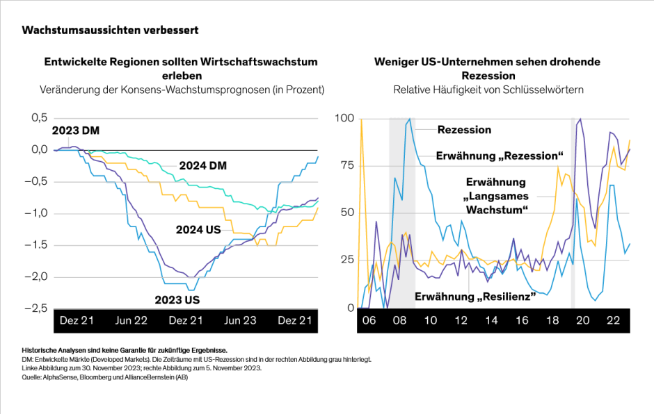 Die Befürchtungen einer wirtschaftlichen Schrumpfung, die das Jahr 2023 beherrschte, haben sich gelegt. Heute herrscht Konsens über ein langsames, aber positives Wachstum für die Industrieländer (Abbildung 1, links). Auch die Unternehmen sind zunehmend optimistisch; in den Gewinnmitteilungen ist weniger von „Rezession“ die Rede, während die Hinweise auf „langsames Wachstum“ und „Widerstandsfähigkeit“ zugenommen haben (Abbildung 1, rechts).