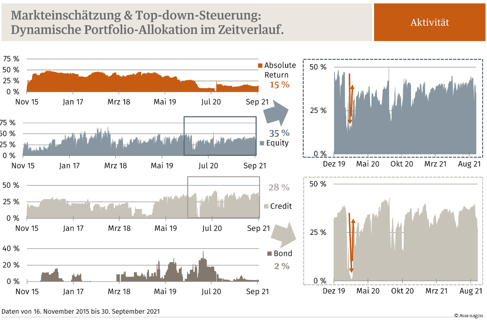 Die Märkte in schwierigen Situationen zu verlassen, sei eine leichte Übung, sagt Thoms Romig. Die Kunst sei es, zum richtigen Zeitpunkt den Wiedereinstieg zu finden. Dafür habe das Fondsteam eine klare Entscheidungsgrundlage. „Wir orientieren uns an Oszillatoren: Wenn der Wert unter 200 geht, ist das für uns ein Kaufsignal, weil der Markt dann aus unserer Sicht überverkauft ist“, so Romig. Auch geldpolitische Entscheidungen könnten ein Kaufsignal auslösen, wie zum Beispiel die Entscheidung der US-Notenbank Fed, die Zinsen nicht zu erhöhen. Im Moment sei der Fonds offensiv ausgerichtet. Der Aktienanteil im Fonds liege bei etwa 40 Prozent. Klassische Anleihen seien derzeit problematisch. „Wir sehen aktuell nicht den risikofreien Zins, sondern das zinslose Risiko“. Den richtigen Mix aus Chance und Risiko zu finden, sei gerade in Zeiten niedriger Zinsen eine große Herausforderung. Staatsanleihen böten derzeit keine Chancen. Stattdessen habe der Fonds eine Reihe von Zinsprodukten im Portfolio, die jenseits klassischer Rentenpapiere Chancen auf Rendite böten. Dazu zählten zum Beispiel besicherte Kredite, Kurzlaufende Unternehmensanleihen sowie Anleihen, die im Rahmen von Sondersituationen gekauft würden, zum Beispiel bei angekündigten Übernahmen. Auch Schwellenländeranleihen, globale und insbesondere skandinavische Hochzinsanleihen spielten eine Rolle. Hier könne man im Vergleich zum klassischen Zinsmarkt überdurchschnittlich hohe Rendite zu erzielen. Ein weiteres Thema seien Asset Backed Securities.