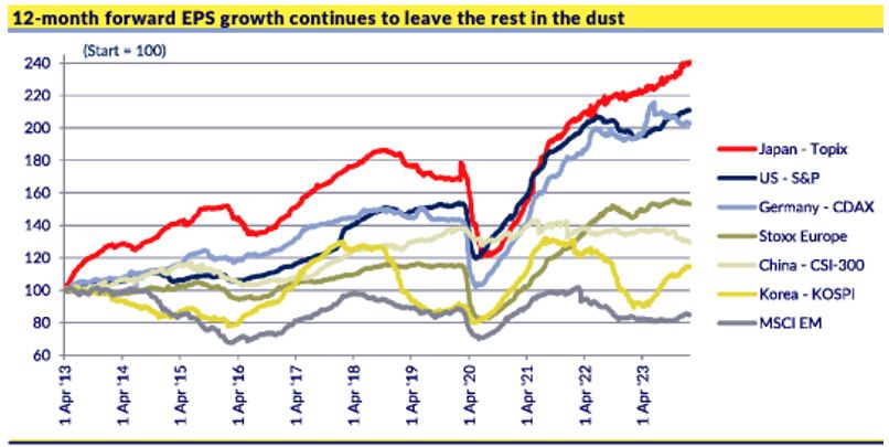 Japan bietet das höchste erwartete Wachstum des Gewinns je Aktie von allen großen Märkten. Quelle: CLSA, Bloomberg, Februar 2024.