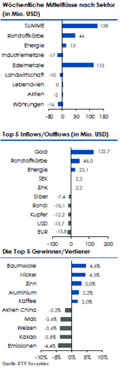 Die Zuflüsse in diversifizierte Rohstoffkorb-ETPs beschleunigten sich mit 46 Mio. USD auf ein 13-Wochen-Hoch. Breit aufgestellte Rohstoffkorb-ETPs (A0KRKC) mit längerfristigem Horizont gewinnen an Attraktivität, da die Anleger in die Anlageklasse umzuschichten scheinen.
