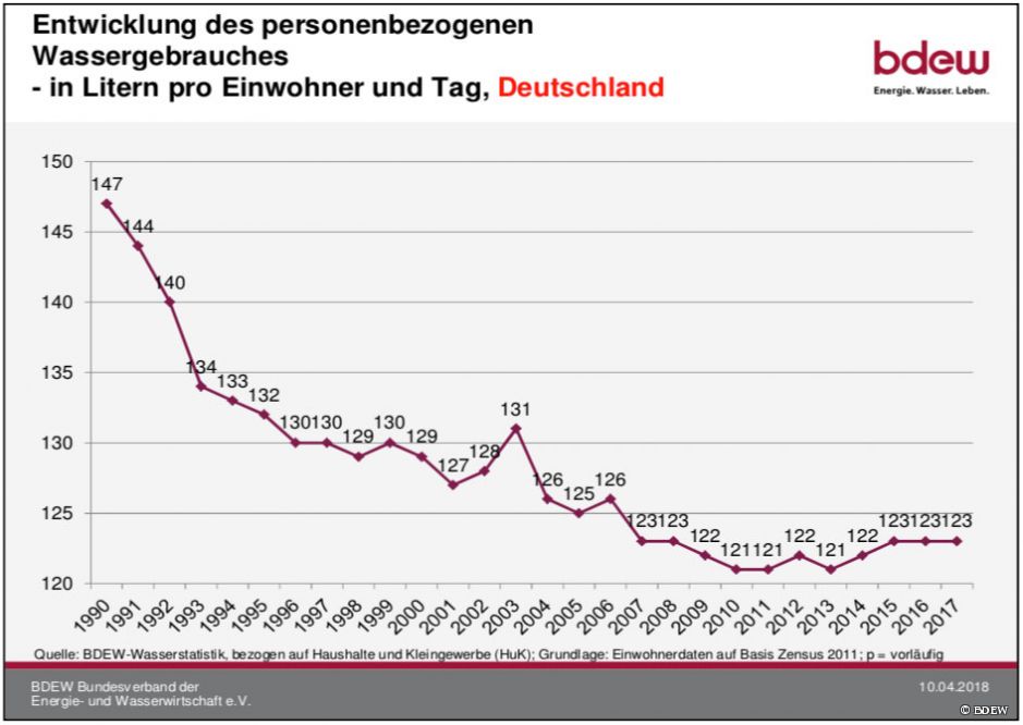 Täglich verbraucht jeder Deutsche durchschnittlich 123 Liter pro Tag. Allein 33 Liter davon fließen durch die Toilettenspülung direkt wieder in den Abfluss, 44 Liter entfallen auf Baden, Duschen und die tägliche Körperpflege. Immerhin: Der Wasserverbrauch pro Kopf ist in Deutschland seit 1990 kontinuierlich gefallen. Vor 30 Jahren lag er noch bei 147 Litern.