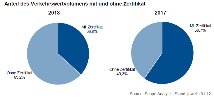 Der Wandel der Branche, weg vom grauen Betongold, hin zum grünen Immo-Investment, dokumentiert eine aktuelle Analyse der Ratingagentur Scope. Das Unternehmen hat die Nachhaltigkeitsausrichtung von 14 offenen Immobilienfonds untersucht. Der Anteil der Objekte mit einem der gängigen Green Building-Zertifikate in den Portfolios der betrachteten 14 Fonds hat sich seit 2013 signifikant erhöht. Dies gilt sowohl in Bezug auf die Objektanzahl als auch auf das Volumen: Im Jahr 2013 konnten rund 27% der Fondsobjekte eine Zertifizierung vorweisen. Ende 2017 waren es bereits 50%. Stellt man auf das Verkehrswertvolumen der Immobilien ab, erhöhte sich der Zertifizierungsanteil im gleichen Zeitraum von 37% auf knapp 60%.