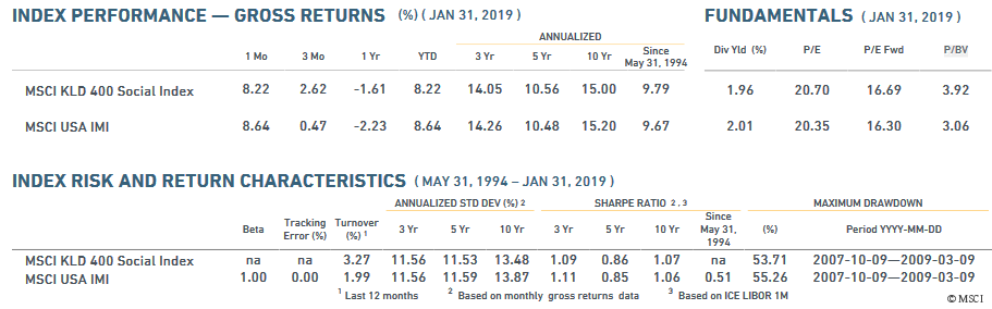 Der MSCI KLD 400 Social Index spiegelt die Performance von 400 US-amerikanischen Unternehmen wider, die spezifischen sozialen und umweltbezogenen Kriterien genügen. Der nach Marktkapitalisierung gewichtete Index enthält rund 250 Aktien aus dem S&P 500, etwa einhundert Großunternehmen, die nicht im S&P 500 gelistet sind sowie knapp 50 weitere Unternehmen, die sich durch ein besonderes soziales Engagement auszeichnen. Bei der Auswahl von Unternehmen für den Index werden vorrangig folgende Faktoren berücksichtigt: die Sozialperformance, die Marktkapitalisierung und die Branche der jeweiligen Unternehmen. Unternehmen, die in den Bereichen Alkohol, Glücksspiel, Kernenergie, Rüstungsgüter, Schusswaffen oder Tabak ihr Geld verdienen, werden grundsätzlich ausgeschlossen. Positivkriterien sind dagegen hohes gesellschaftliches Engagement, eine soziale Unternehmensführung, Umweltschutz, sichere und nützliche Produkte sowie Menschenrechte.