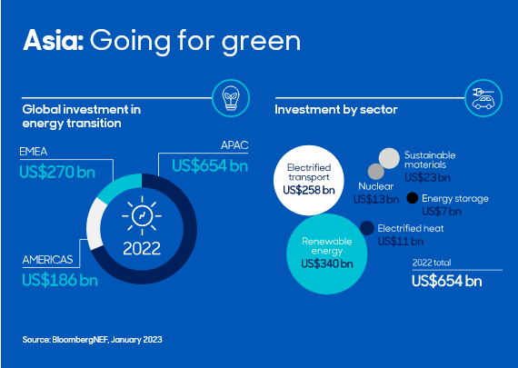 Asien investierte im Jahr 2022 etwa 40 % mehr in die Energiewende als EMEA und Amerika zusammen.3