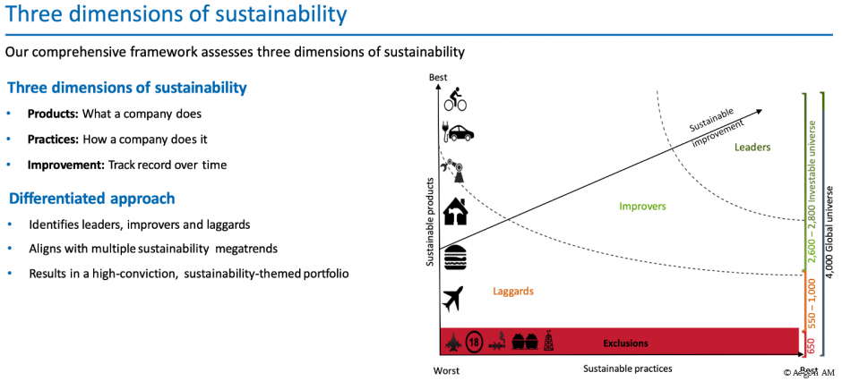 Die Frage, wie man als Fondsmanager solche Vorzeige-Unternehmen finde, beantwortet Kiselev mit einem Stufenmodell. Wichtig für die Eingrenzung infrage kommender Firmen sei eine genaue Definition der Art von Nachhaltigkeit, die er suche: Kiselev benennt dafür zunächst die drei Dimensionen von Nachhaltigkeit – Produkte, Praktiken und stetige Weiterentwicklung – und erklärt, wie er auf Unternehmensebene Markt- und Innovationsführer, Verbesserer und Nachzügler erkennt und bewertet (siehe Grafik unten). Auf die Gruppe der „Verbesserer“, die sogenannten Improver, konzentriere er sich.