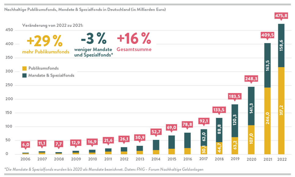 Abb. 1: Nachhaltige Publikumsfonds, Mandate & Spezialfonds in Deutschland in Milliarden Euro | Quelle: FNG-Marktbericht 2023