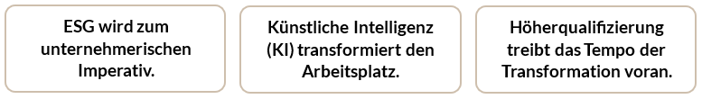 Unsere Lebensumstände und -realitäten verändern sich, und mit ihnen auch die Anforderungen an Unternehmen und ihre Mitarbeitenden. Der Wandel ist unaufhaltsam, aber er birgt auch enorme Chancen. Unternehmen, die heute auf ESG, KI und Höherqualifizierung setzen, sichern sich ihren Platz in der Zukunft.