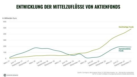 Viele Sparer hegen den Wunsch, dass ihre Anlagen im Einklang mit ihren Werten und Überzeugungen stehen. Gemäß von Morningstar und Carmignac bereitgestellten Daten verzeichneten nachhaltige Aktienfonds in den vergangenen fünf Jahren bis Ende 2021 Nettozuflüsse (Differenz zwischen Zu- und Abflüssen) in Höhe von 483 Milliarden Euro gegenüber 188 Milliarden Euro für herkömmliche Fonds im gleichen Zeitraum1.