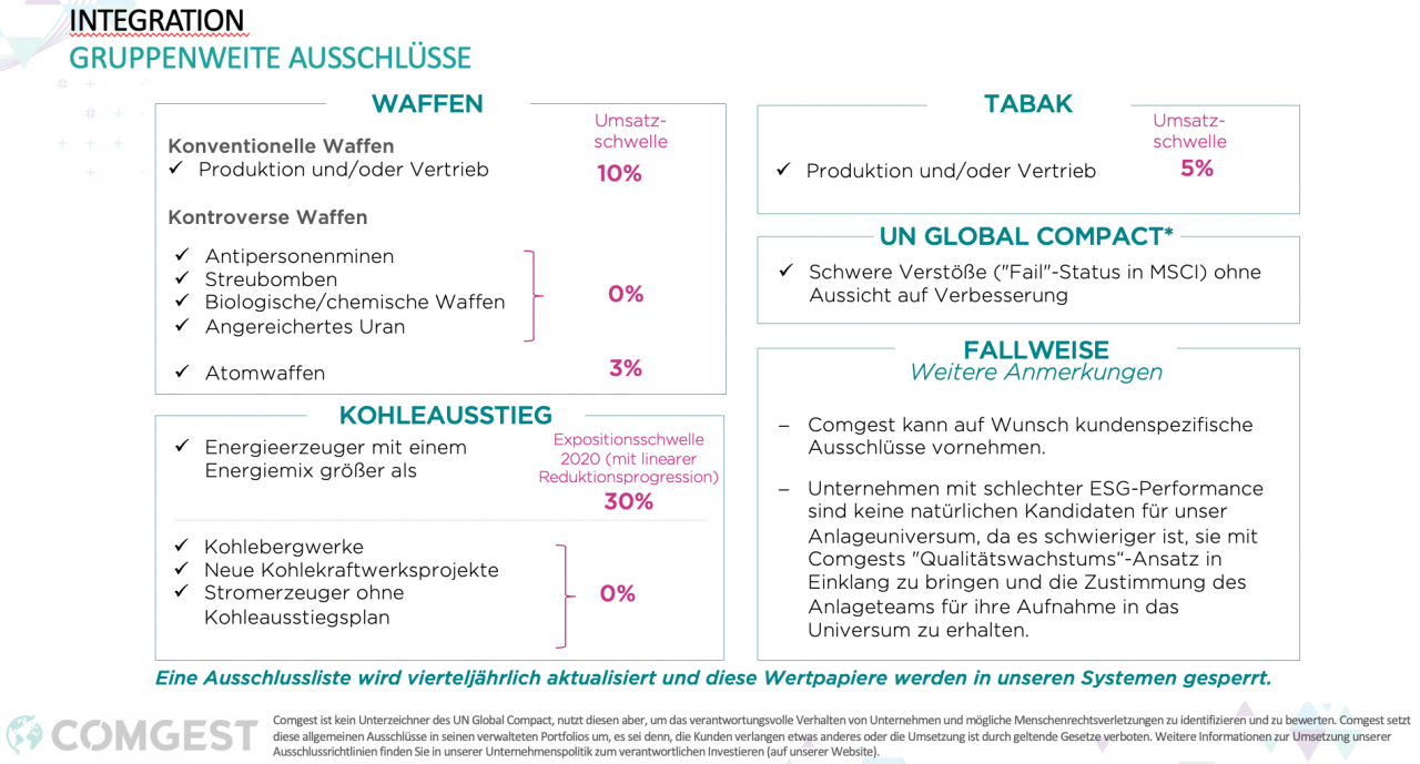 Der ESG-Investmentprozess ist für alle Comgest-Fonds identisch. Zunächst werden Unternehmen aus dem Anlageuniversum ausgeschlossen, die wichtige Nachhaltigkeitskriterien nicht erfüllen. Dies geschieht anhand der portfoliospezifischen Ausschlüsse. Ein Beispiel sind Nuklearwaffen. „Der intensive fundamentale und ESG Research, bei dem wir uns weitestgehend auf uns selbst und nicht auf externe Datenanbieter verlassen, finden danach Hand in Hand statt und zwar bei Aufnahme des Unternehmens in das Investmentuniversum sowie schließlich im Portfolio mit einem kontinuierlichen Monitoring“, so Fickus.